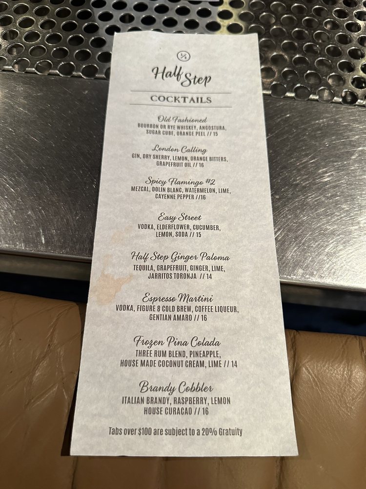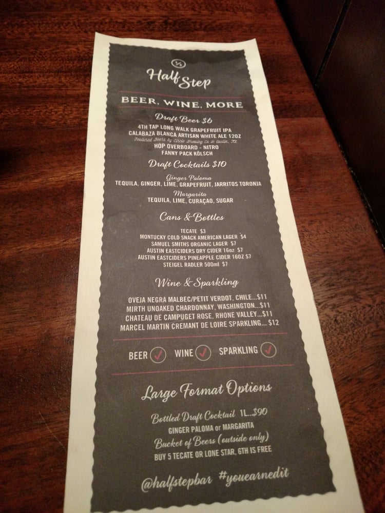 Half Step, located at 75 1/2 Rainey St in Austin, TX, is a trendy and classy spot known for its unique cocktails and vibrant atmosphere. With a full bar and live music on the weekends, this place is perfect for a night out with friends. The cocktails are a mix of classic and innovative flavors, such as the Bartender's Choice and the Daiquiri Rum. The outdoor seating is heated and covered, making it a great option year-round. The menu also features a selection of beers, wines, and sparkling drinks. Overall, Half Step offers a hip and casual vibe, making it a must-visit for those looking for a fun night out in Austin.